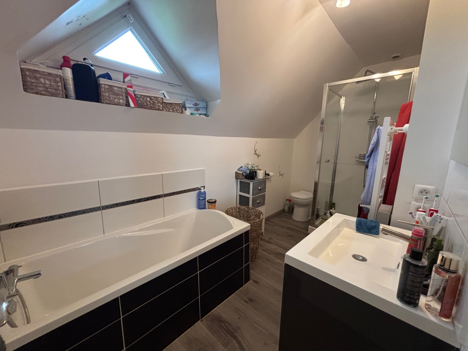 A l'étage: Un joli palier dessert 3 chambres (une avec dressing) , une salle de bains avec douche et baignoire et wc sanibroyeur.