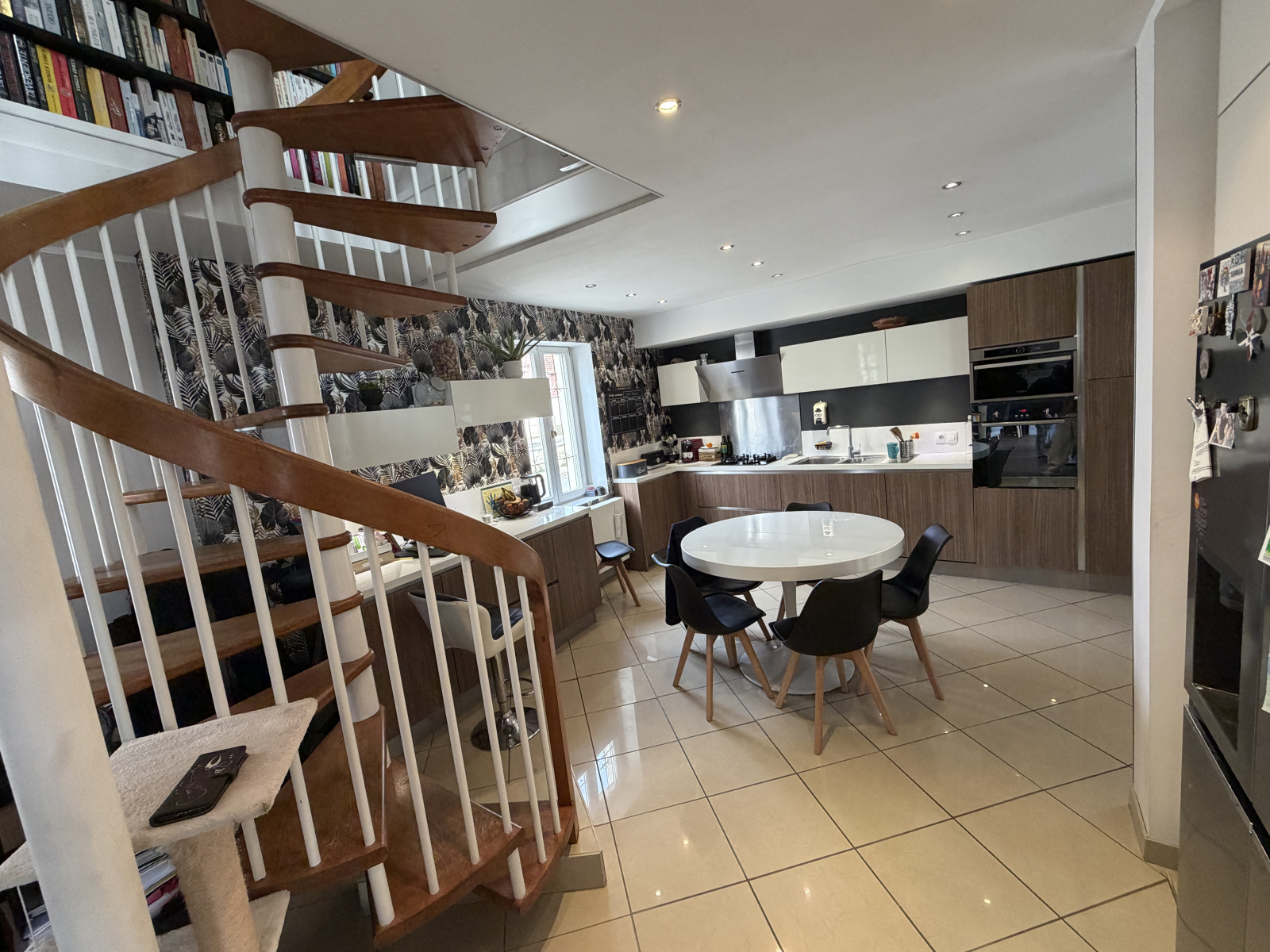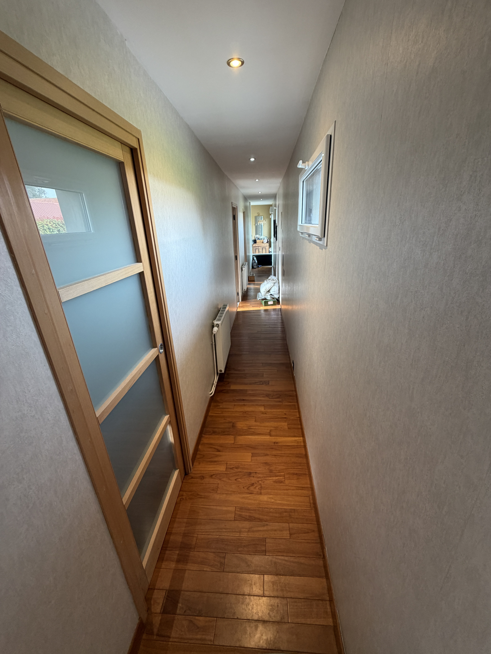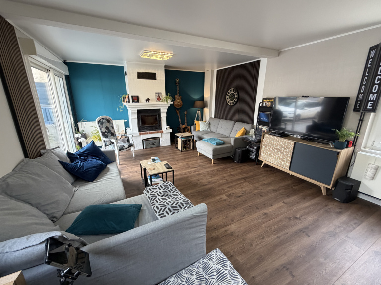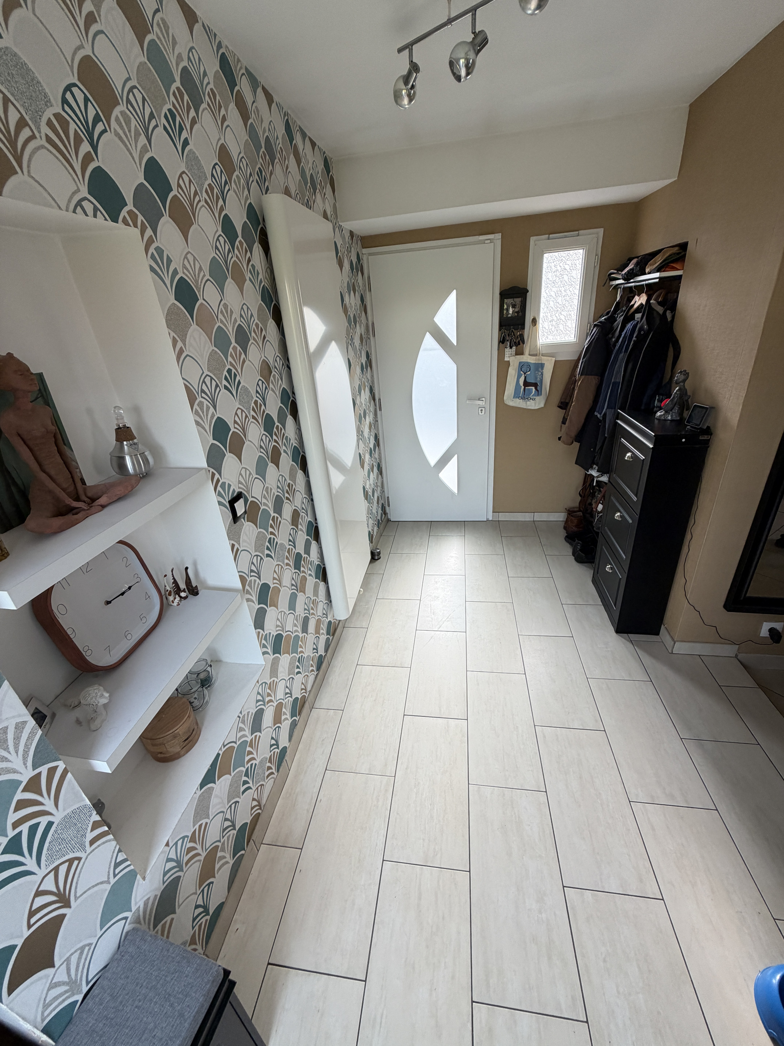 Grande entrée lumineuse desservant une cuisine neuve, aménagée et équipée, ouverte sur un séjour-salon chaleureux agrémenté d’une cheminée.